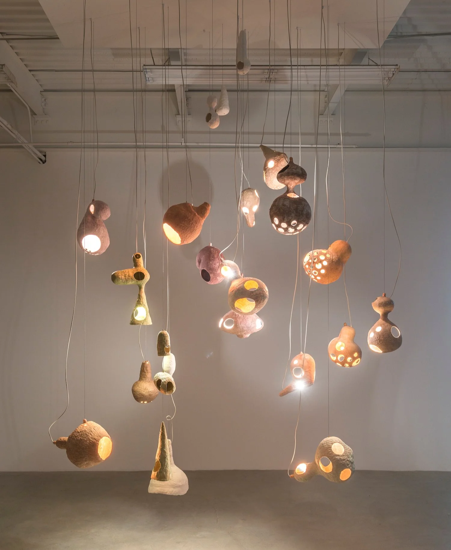 Green Mobiles, 2025. Paper pulp and wire, 84 x 360 x 144 inches (213 x 914 x 366 cm) Installation view with 35 mobiles