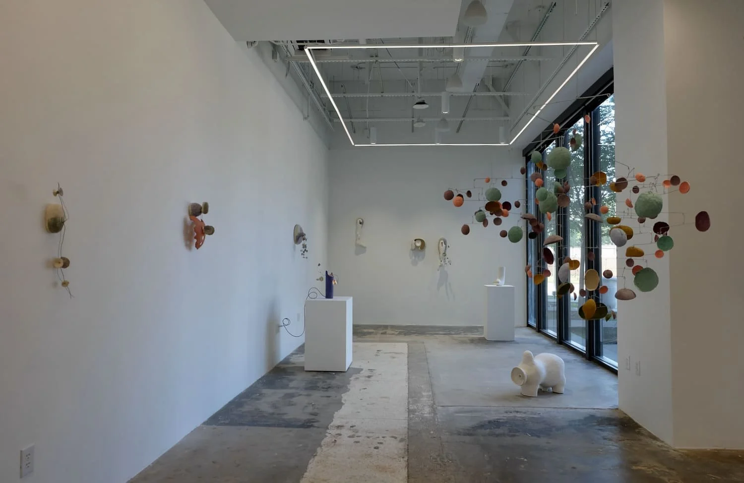 The ceramic sculptures, like legs, eyes and bellies disrobed at the end of the night, respond to the mobiles’ friendly motions and colors and exist in the space of complete trust, resting.